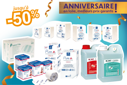 Compresses en non tissé, bandes adhésives élastiques, pansements, chlorhexidine, alcool isopropylique... en promotion Anniversaire !