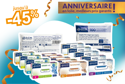Gants latex, gants vinyle, gants nitrile, doigtiers… en promotion Anniversaire !
